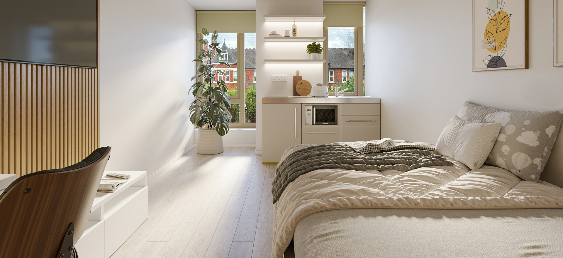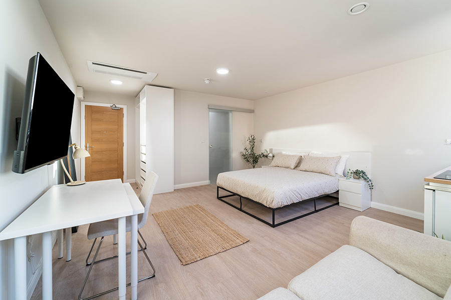 The Premium Studio is slightly larger than our Classic, offering a private room with a double bed and en-suite, along with a premium kitchen and living space.
